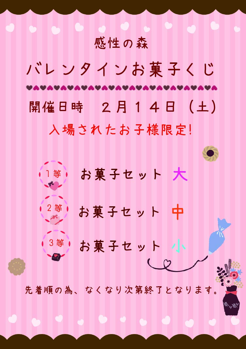 投稿日: 2026年2月12日 投稿者: hillsidemall★2月14日限定!バレンタインお菓子くじ★ 開催内容が変更・延期・中止になる場合がございますので予めご了承ください。 皆様のご来店お待ちしております!